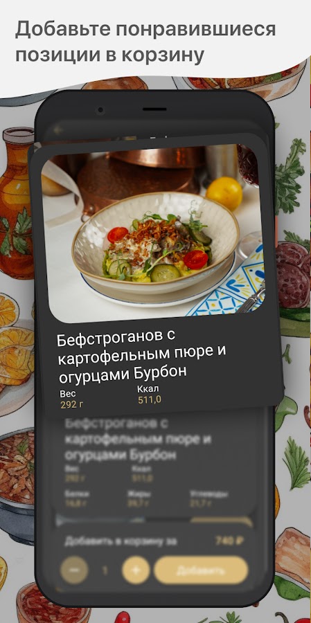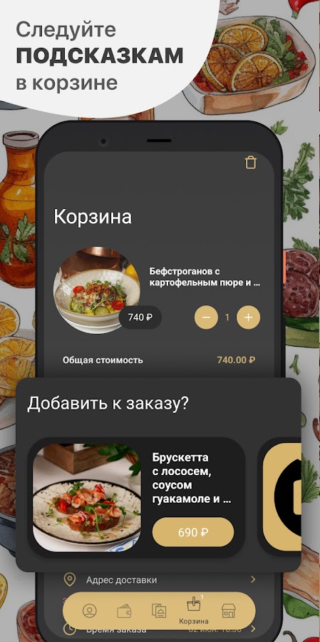 Как сделать заказ в приложении “Prosto Resto”: выберите понравившиеся позиции из меню, добавьте их в корзину и перейдите на экран оформления заказа (по нажатию на иконку корзины).