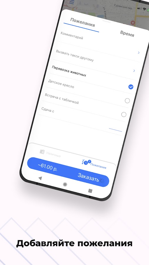 Добавьте к заказу дополнительные пожелания. Например, когда едете с ребенком — выберите «детское кресло». Если везете своего питомца — укажите «Перевозка животных».