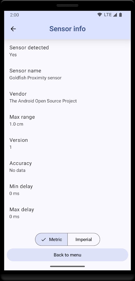 Тест расстояния: получите точное значение расстояния, которое определяет ваш датчик приближения. Обратите внимание, что только небольшое количество смартфонов может это сделать! Большинство телефонов будут отображать только фиксированное значение расстояния.