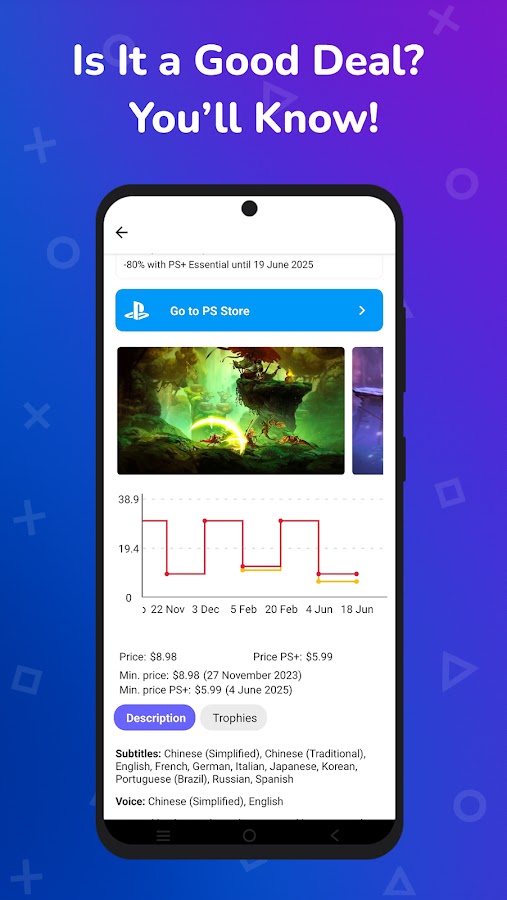 Наше приложение отслеживает все распродажи, скидки и ограниченные по времени предложения в PlayStation Store. Используйте реальные данные и аналитику цен, чтобы решить, когда покупать игры для PS4 и PS5.