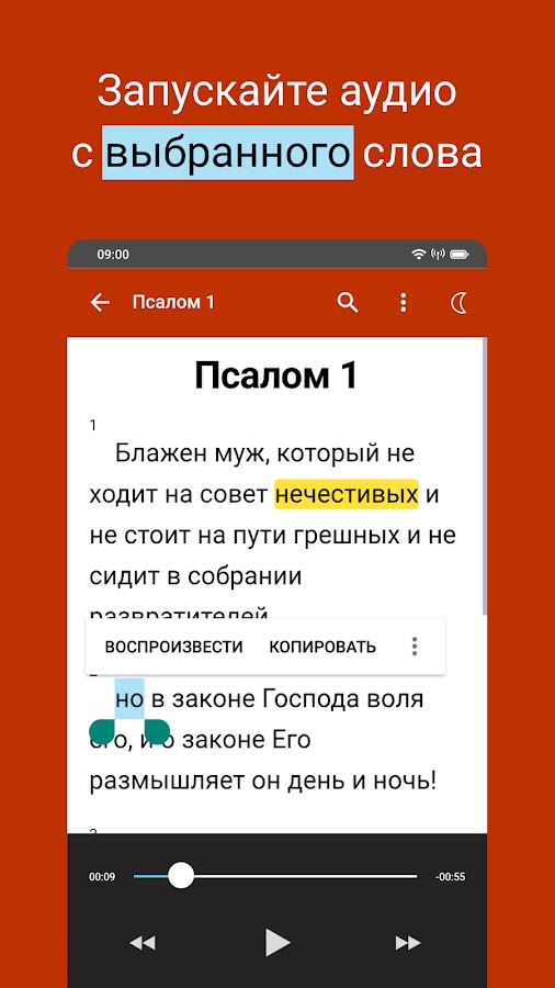 ・Воспроизведение с выбранного слова при помощи долгого касания;