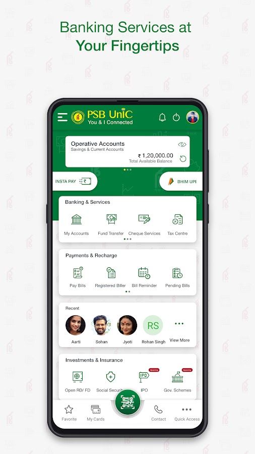 Мобильное банковское приложение PSB UnIC — это универсальное решение, позволяющее отправлять деньги, просматривать данные счета, формировать выписки, инвестировать в срочные депозиты, управлять дебетовой картой, чековыми услугами и многими другими эксклюзивными услугами прямо у вас под рукой. Приложение PSB UnIC позволяет переводить средства внутри и за пределы банковского счета с помощью UPI, NEFT, RTGS, IMPS.