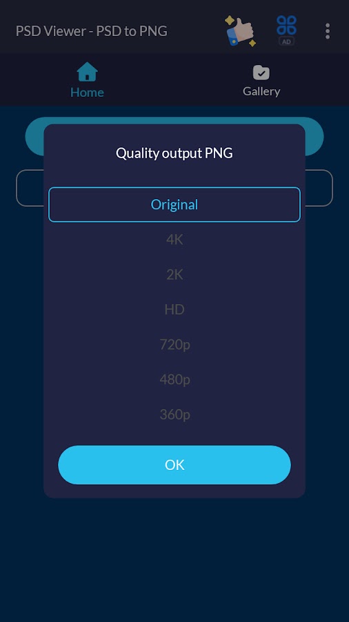 Вы можете выбрать качество выходного изображения: Исходное, 4K, 2K, HD,….