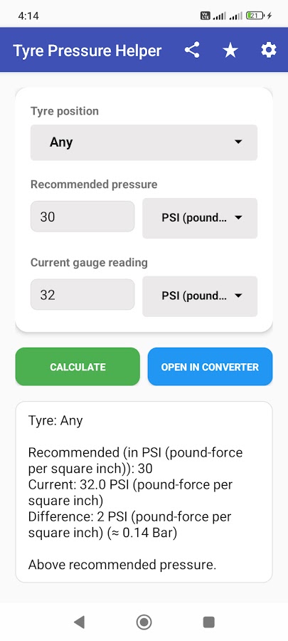 Check if your tyre pressure is within the recommended range. Select tyre position (front left, front right, rear left, rear right), enter recommended and current pressure in PSI, BAR or kPa, and get an instant status — below, within,