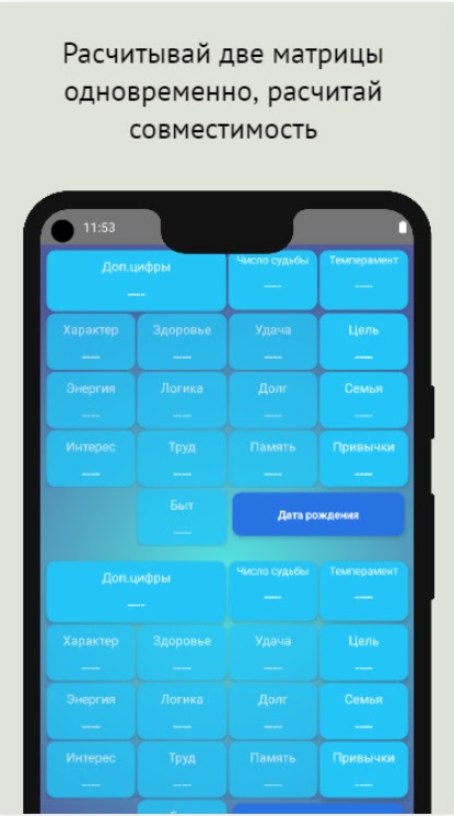 — подробное описание вашей матрицы и влияние ее на вашу личность с помощью простого и удобного интерфейса