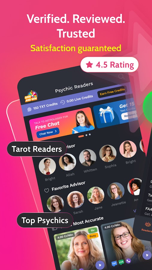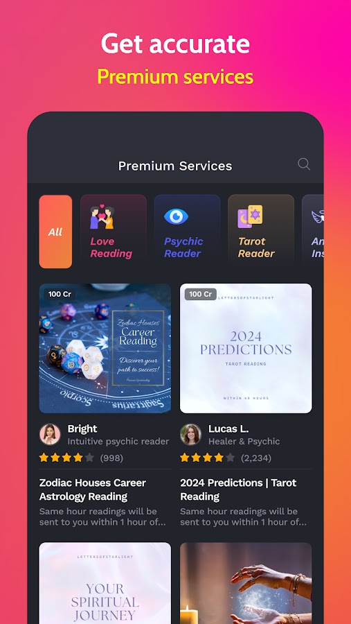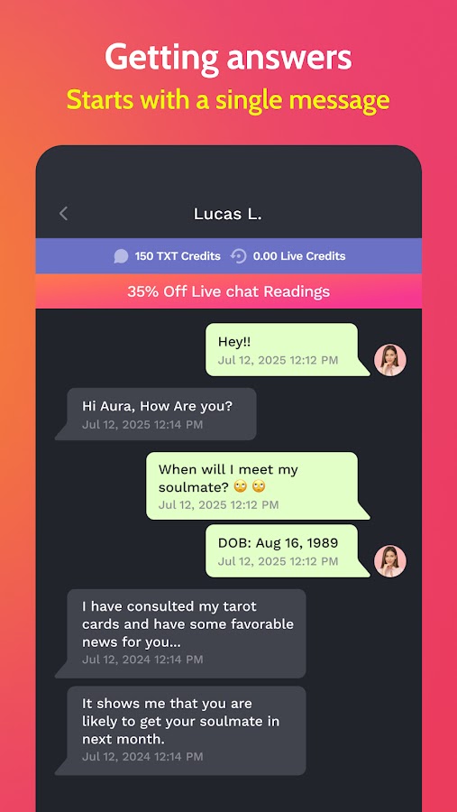 Psychic Txt — это одно из тех приложений для гадания, которое на самом деле соединяет вас с личным духовным проводником, делающим предсказания о любви, работе и будущем. Наши практикующие эксперты-астрологи специализируются на предсказаниях, картах таро и духовных наставлениях. Их дар поможет вам раскрыть правду обо всем, что вас интересует.