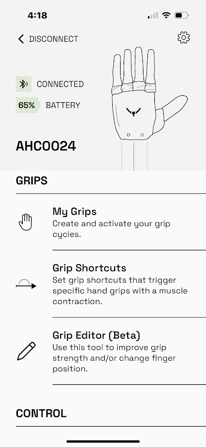 Это телефонное приложение используется для управления, настройки и обновления PSYONIC Ability Hand.