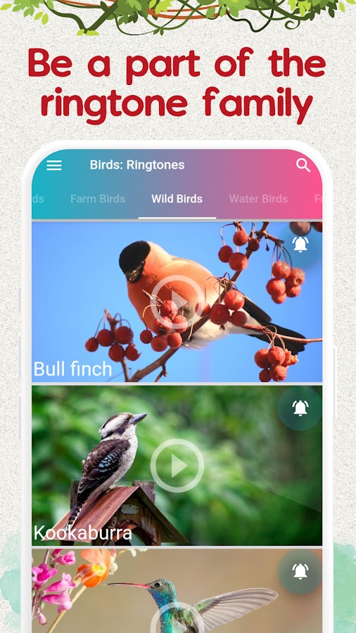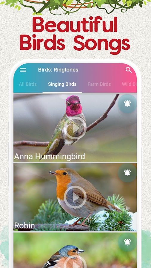 это приложение для звуков птиц также имеет категорию для пения птиц. вы можете найти рингтоны для птиц, которые демонстрируют красивые песни птиц.