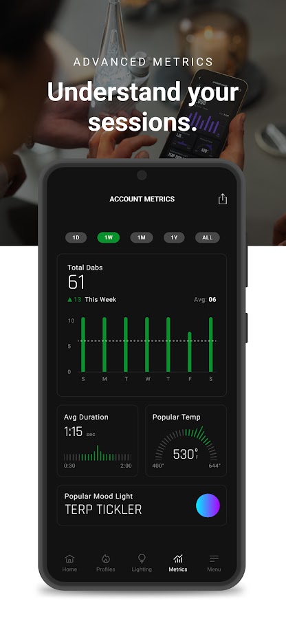 Puffco Connect дает вам беспрецедентный контроль над работой Peak Pro. Получите более глубокое понимание с помощью новых расширенных показателей, создавайте собственные профили нагрева с точной детализацией и проектируйте свое настроение с помощью цветов и анимации.