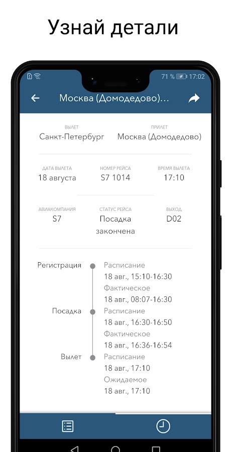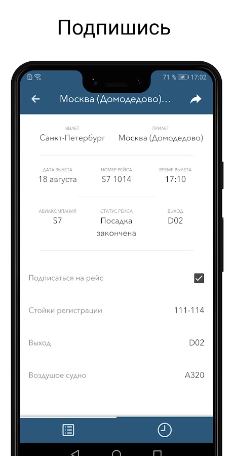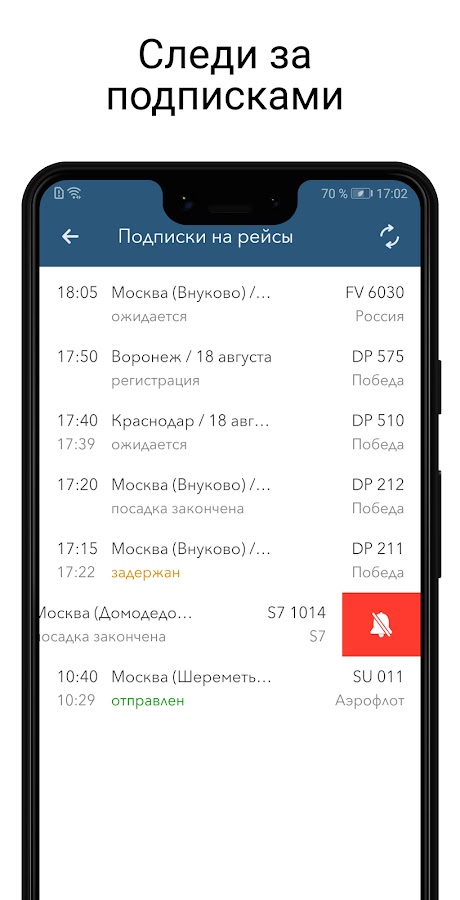 Вы сможете с легкостью найти необходимый Вам рейс, воспользовавшись удобным поиском. Узнать подробную информацию по рейсу и подписаться на него. Подписавшись, Вы будете получать Push уведомление о том, что произошли изменения в этом рейсе!