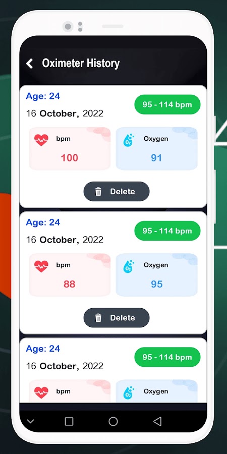 Это приложение позволяет ежедневно отслеживать пульс и уровень кислорода в крови. Это очень просто, просто записывайте измерения и проверяйте статистику с течением времени. Пульсоксиметр и насыщение крови кислородом (SpO2), частота пульса (PR) и индекс перфузии (PI). Вы можете использовать это приложение для отображения записей и просмотра измеренных данных, а также для управления своим состоянием здоровья.