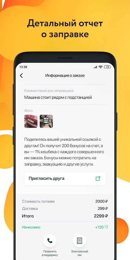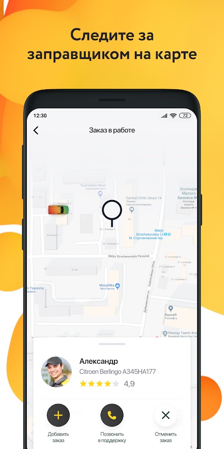 Укажите место, количество литров и удобное время. Наш заправщик привезет топливо и заправит ваш автомобиль. Если вы оставите лючок бензобака приоткрытым, мы заправим авто без вашего участия. Вы можете заниматься своими делами – приложение проинформирует вас о выполнении заказа.