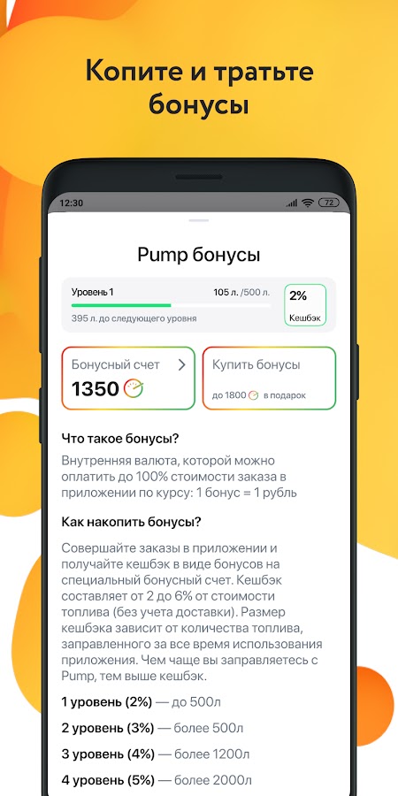 В приложении PUMP действует система кешбэка. Наши постоянные клиенты получают от 2 до 6% от стоимости заказа бонусами на свой счет. Бонусами можно оплатить топливо и другие услуги сервиса по курсу 1 бонус = 1 рубль.