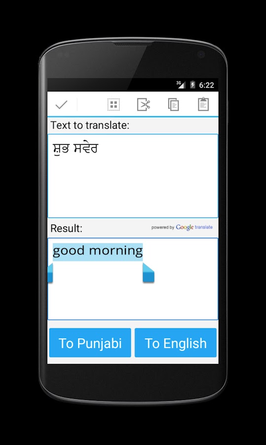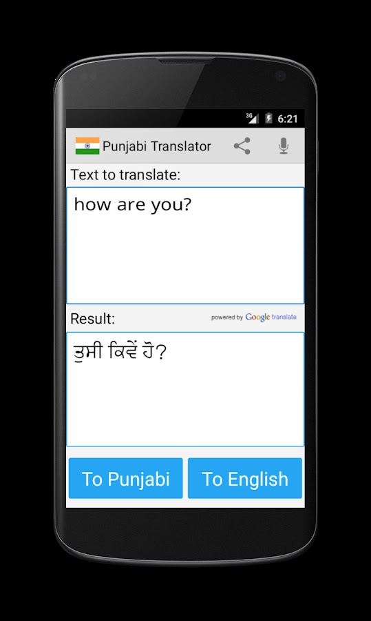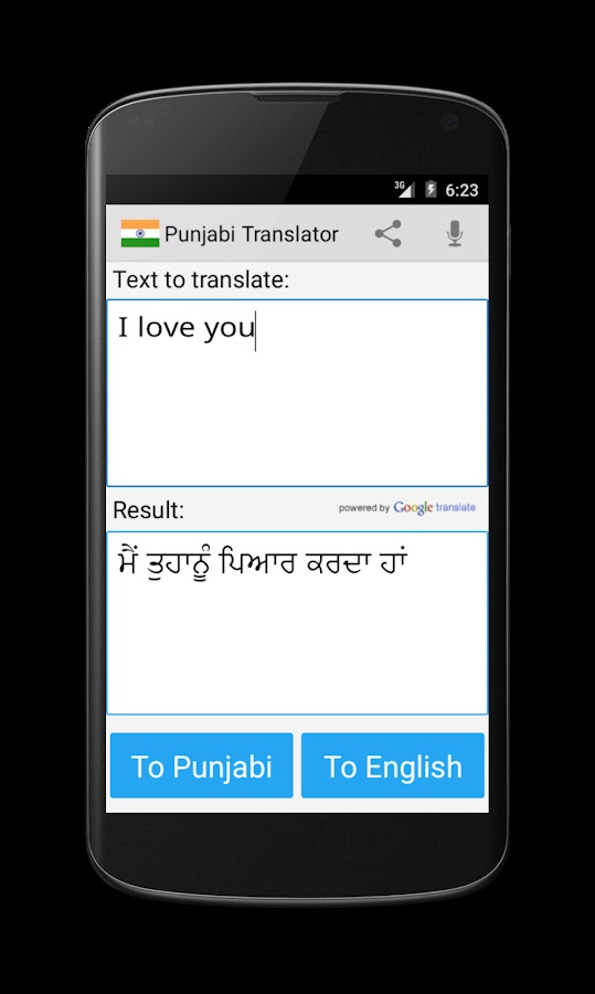 Это приложение может переводить слова и тексты с английского (или русский) для панджаби, и от панджаби на английский язык. Лучшее приложение для легкого и быстрого перевода, который может быть использован как словарь.