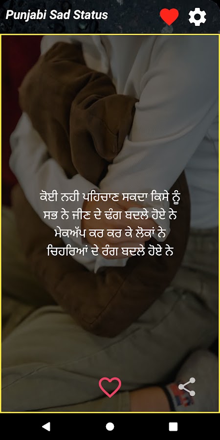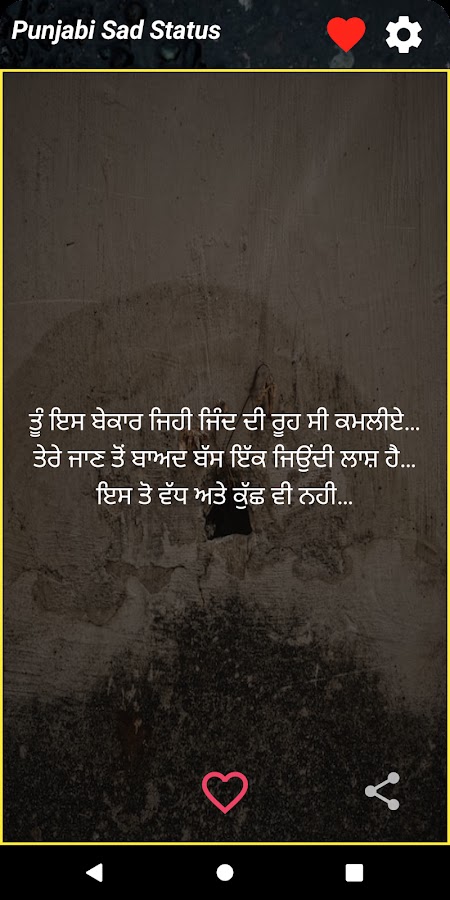 Хотите ли вы выразить свое горе, боль или разбитое сердце, приложение Punjabi Sad Status поможет вам. Приложение имеет широкий спектр категорий, в том числе пенджабские грустные шайари с фото, грустные шайари на пенджаби, пенджабские бевафа шайари, пенджабские духи шайари, дард бхари шайари пенджаби и многое другое. Вы также можете найти коллекцию грустной поэзии на пенджаби, грустную поэзию в автономном режиме на пенджаби и даже лирический контент, которым можно легко поделиться на других платформах одним нажатием кнопки.