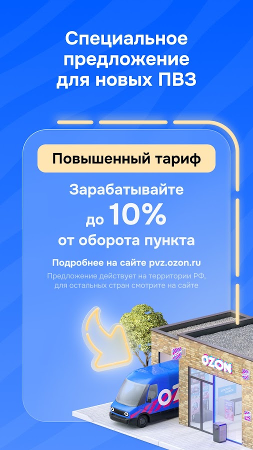 «Пункт Ozon» — приложение для открытия пункта выдачи заказов и управления им. Запускайте ПВЗ и зарабатывайте вместе с Ozon — финансово поддерживаем новые пункты и рассказываем об их открытии покупателям поблизости.