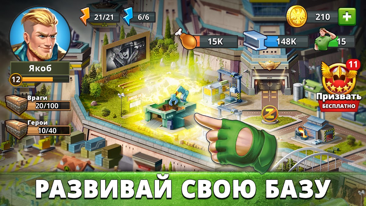 Стройте и улучшайте здания, чтобы превратить рекрутов в героев. Собирайте еду, добывайте металл и мастерите предметы, которые помогут вам в бою.