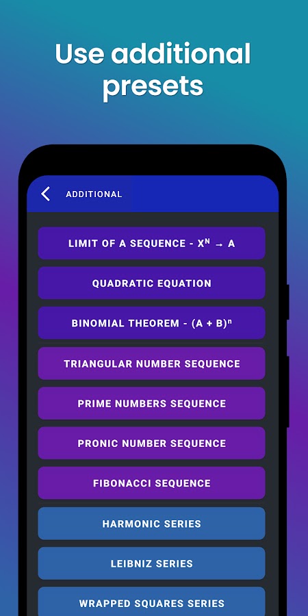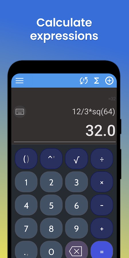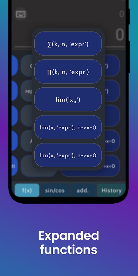 Примечание: вы можете использовать собственную клавиатуру для ввода выражения. Перед вами есть набор кнопок: нажатие каждой из них добавляет символ в верхнее поле. После ввода выражения нажмите =, в нижнем поле появится результат, а в верхнем поле появится примерно равное ему значение. При выборе функций (например, cos(x)) необходимо ввести аргумент, от которого зависит функция, и закрыть скобки. Если их несколько, необходимо перечислить их через запятую, причем важен порядок. Выражение в качестве аргумента должно быть заключено в одинарные кавычки (‘expr’): ∑(k, n, ‘выражение’) -> sum(0, 100, ‘1 + k’)
