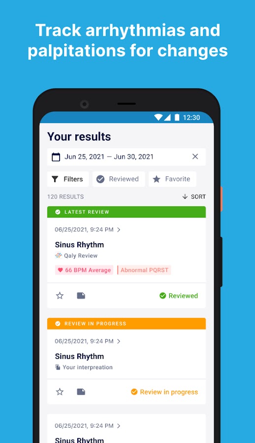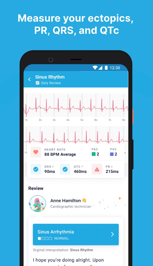 • Просматривайте интервалы PR, QRS и QTc на вашей ЭКГ, также проанализированные экспертом.