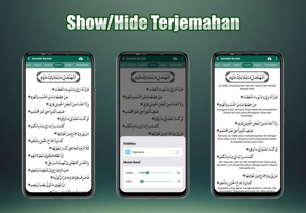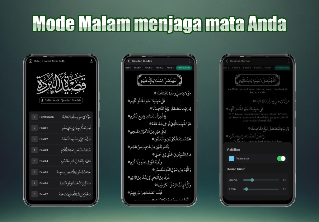 Чтение на арабском языке в этом приложении не представляет собой отсканированное изображение, поэтому вы можете легко понять каждое написание и перевод. Размер текста можно регулировать в соответствии с удобством чтения. Чтобы изменить размер шрифта, щелкните значок с тремя точками в правом верхнем углу страницы, затем переместите доступный ползунок по мере необходимости.