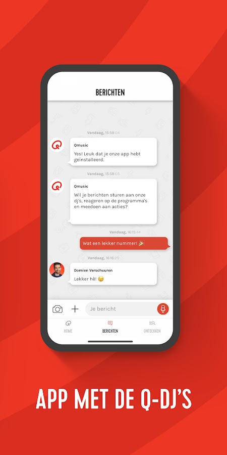 Отправляйте бесплатные сообщения своим любимым радио-ди-джеям. Дайте нам знать, что вы думаете об определенных темах. Вы можете просто получить сообщение от вашего любимого радио-ди-джея! Потому что Mattie Valk, Marieke Elsinga, Domien Verschuuren, Bram Krikke и все другие ди-джеи Qmusic проверяют вашу реакцию на трансляцию через приложение во время трансляции. Вы даже можете отправить аудиосообщение и услышать себя в прямом эфире по радио. Q звучит лучше с тобой!
