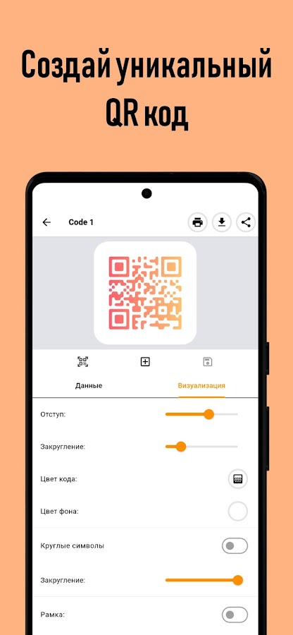 • Печатайте коды прямо из приложения: предварительно разместите их на листе, настройте размер, отступы и количество