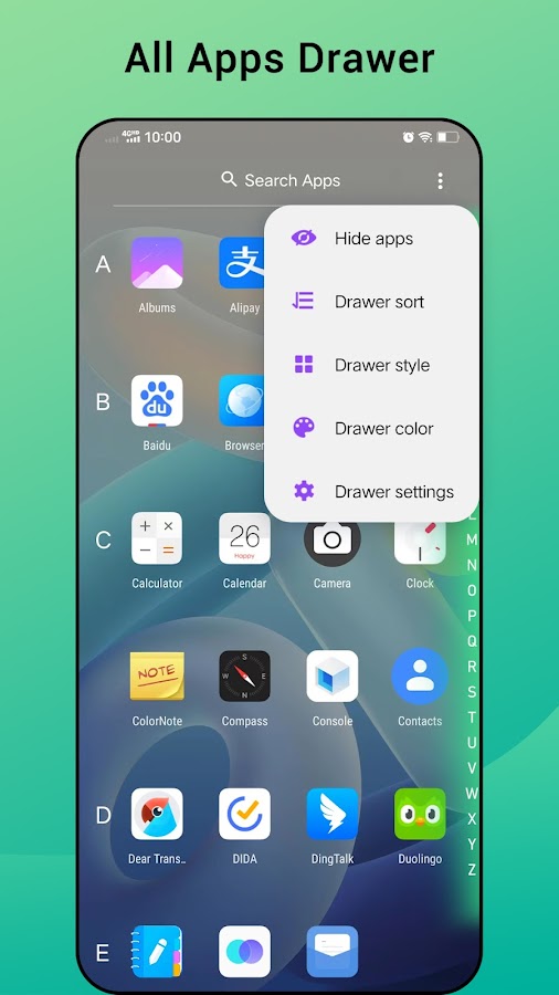 — Панель приложений с алфавитным указателем для удобного поиска приложений — находите то, что вам нужно, за считанные секунды с помощью Quick Launcher