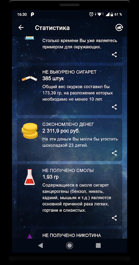 Приложение создано для тех, кто решил отказаться от курения. Оно помогает видеть свой результат и вдохновляться достижениями.