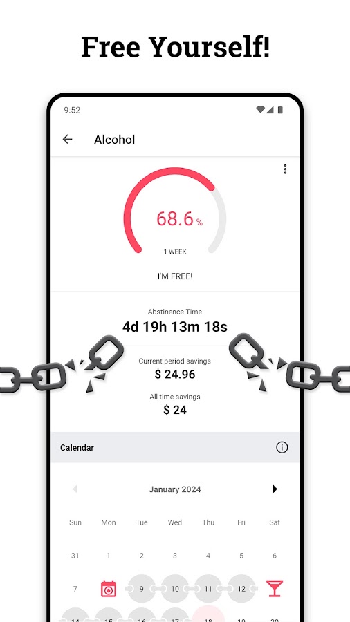 Обязуйтесь бросить! Анализируйте свой прогресс. Вы можете добавить точный день, когда последний раз вы это делали, деньги, которые вы потратили на зависимость, и пусть это послужит для вас отправной точкой. С этого момента вы можете получить тонны интересной статистики Время воздержания и сэкономленные деньги являются ведущей статистикой.