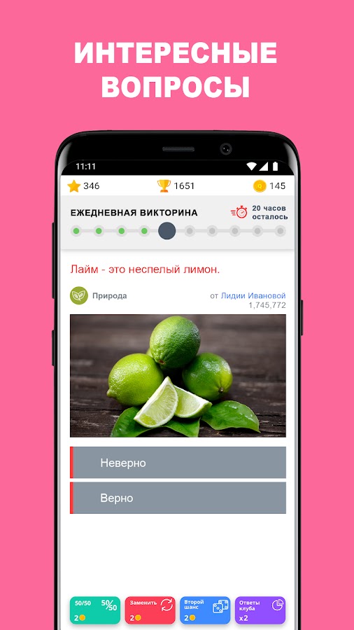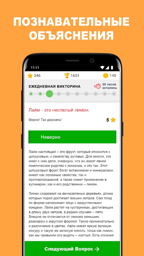 Иногда ты будешь получать вопросы непредвиденной сложности – нам кажется, что элемент случайности делает игру веселее, а разумные объяснения правильных ответов становятся уникальным шансом узнать что-то новое.