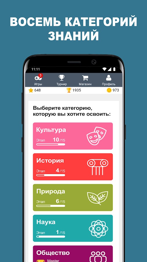 Проверь свои знания в самых интересных и популярных категориях: история, литература, страны мира, еда, популярная культура, музыка, биология, анатомия.