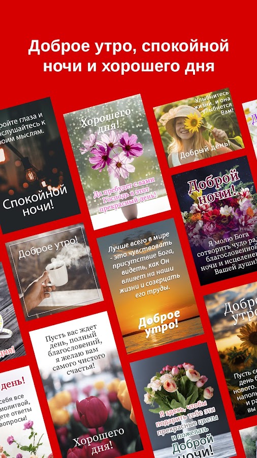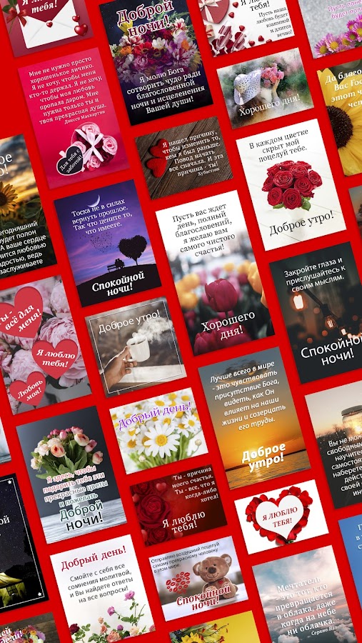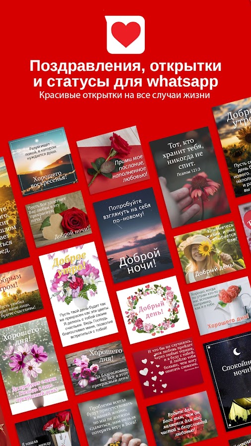 Это приложение создано для тех, кто хочет радовать своих друзей и близких ежедневными красивыми открытками с пожеланиями на любой случай жизни. Каждый день новые изображения и приятные пожелания с добрым утром, хорошего дня, спокойной ночи, приятной недели, мудрые слова о любви, религии, вере, мотивации, привязанности, отношениях, браке, а также шутки, поздравления с днем рождения и многое другое…