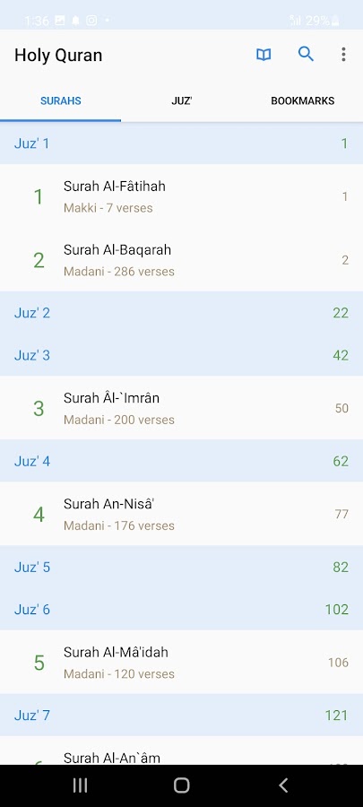 • Простой и элегантный интерфейс позволяет легко использовать применение Священного Корана