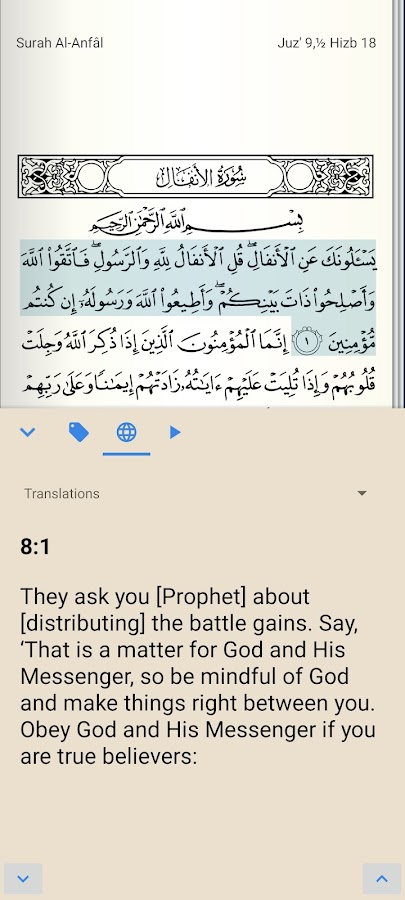 • Вы можете также загружать и отображать большую коллекцию переводов Священного Корана параллельно с Кораном на арабском языке
