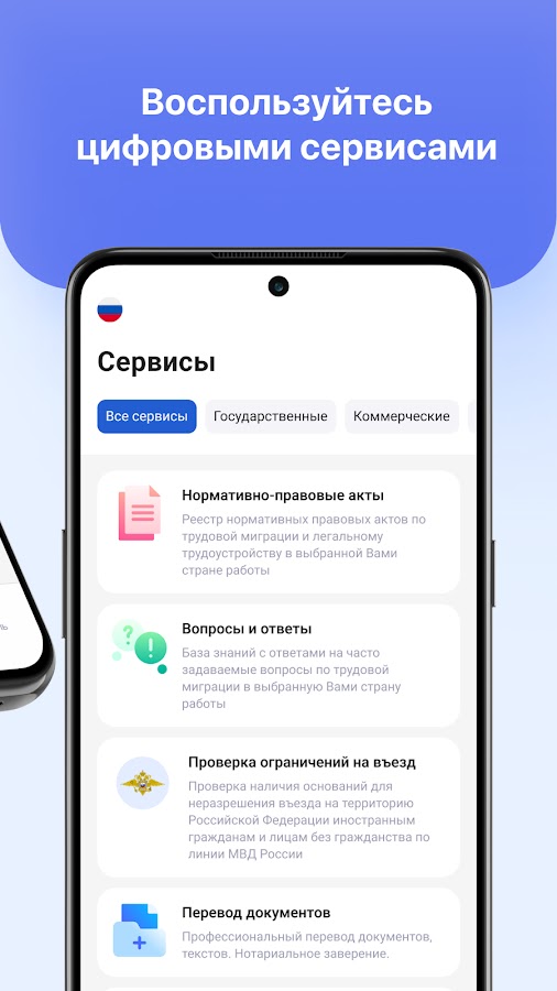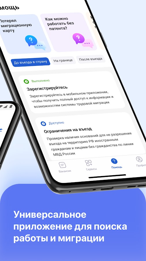 Приложение «Работа в ЕАЭС» позволяет искать работу, проверять ограничения на въезд, получать доступ к цифровым сервисам трудоустройства, осуществлять денежные переводы за рубеж, приобретать полис добровольного медицинского страхования (ДМС), заказывать нотариально заверенный перевод документов, сдавать пробный экзамен для получения патента/разрешения на временную работу, вид на жительство/ВНЖ в Российской Федерации, Республиках Армения, Беларусь, Узбекистан, Казахстан, Кыргызстан и Таджикистан.