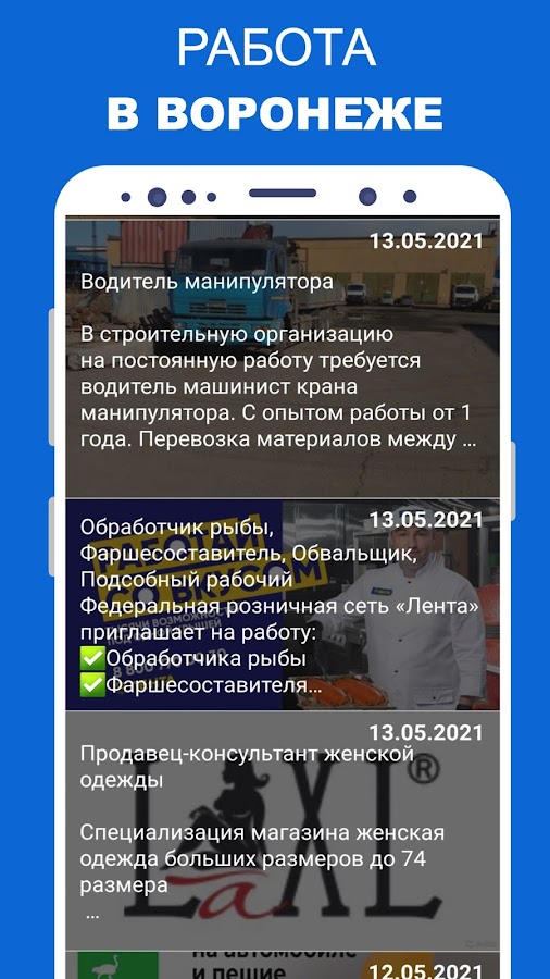 При помощи нашего приложения легко найти именно ту вакансию в Воронеже, которая более всего подходит именно вам. Мы предлагаем на выбор трудоустройство для женщин и для мужчин, с опытом и без опыта работы. Есть варианты с ежедневной оплатой по итогам дня, с проживанием на территории работодателя.