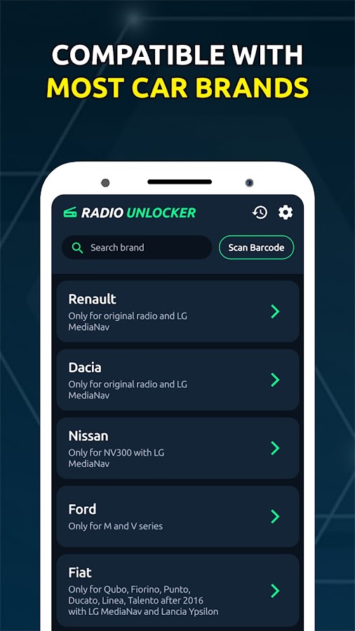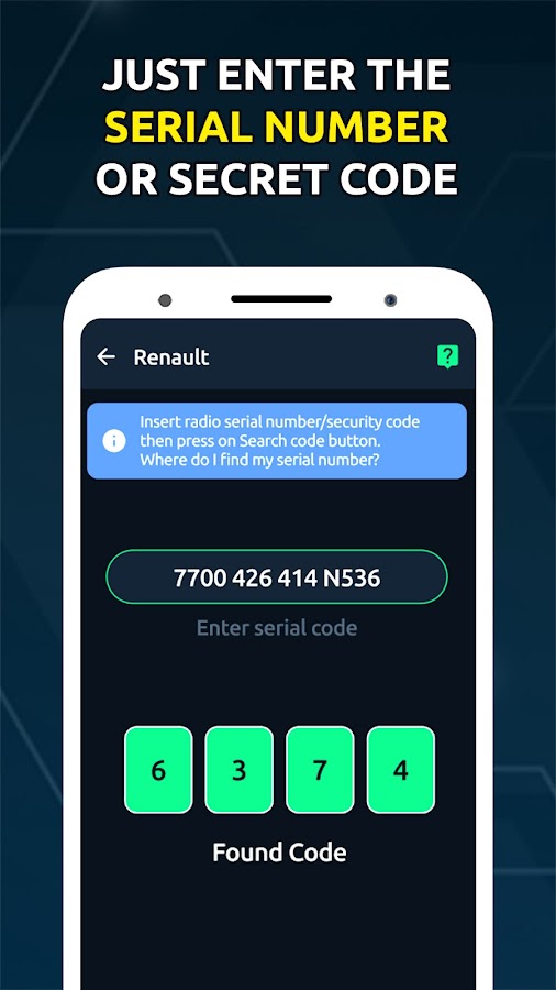 «Radio Code Unlocker» — это приложение-генератор кодов для стереосистем, которое может предоставить коды разблокировки автомобильных магнитол для большинства автомобилей. С помощью этого приложения вы легко найдете серийный код для вашей автомобильной магнитолы. Например, если вы управляете Renault, просто используйте VIN-номер или регистрационный номер, чтобы получить код для вашей магнитолы.