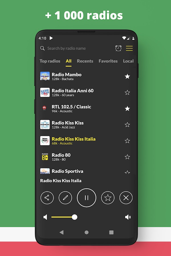 Благодаря простому в использовании, быстрому и современному интерфейсу Radio Italy предлагает вам лучший опыт онлайн-прослушивания без подписки или оплаты для доступа к приложению! Также воспользуйтесь нашим виджетом для еще более приятного и простого доступа и прослушивания!