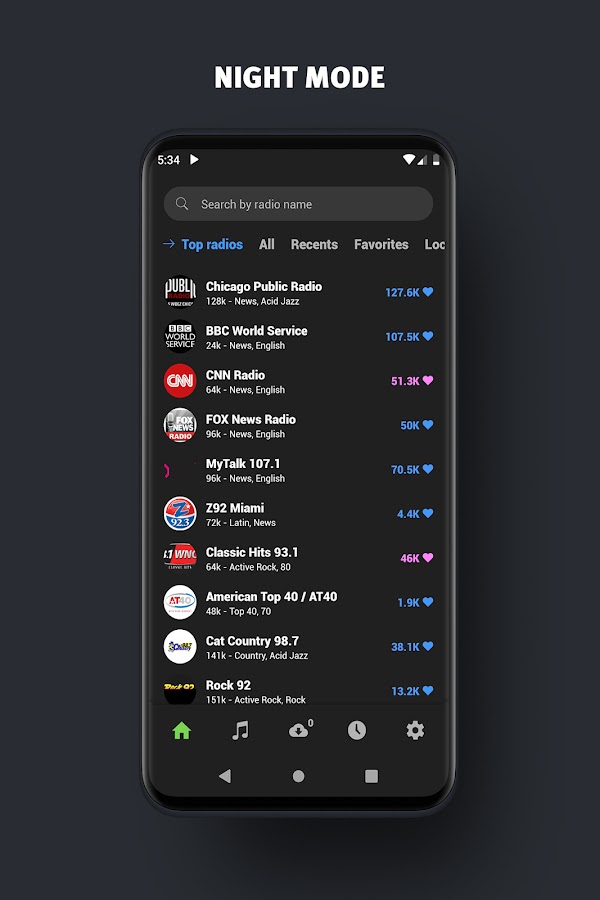 Немедленно используйте приложение Radio USA, чтобы слушать все живые американские радиостанции, такие как FOX News Talk, VOA Learning English, Bloomberg, New York Hott, 100hitz Top 40 Hitz, 80’s 90’s Music, Jazz24, Chicago Public, USA Dance, BBC World Service, Love Songs 247, Hot Country B104.7, MyTalk 107.1, Rock 92, NewsTalk 99.1 и многие другие популярные радиостанции, чтобы открыть для себя!