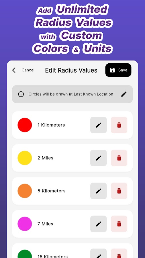 — Круги неограниченного радиуса: создавайте неограниченное количество кругов с настраиваемыми значениями радиуса и единицами измерения (мили, километры или футы).