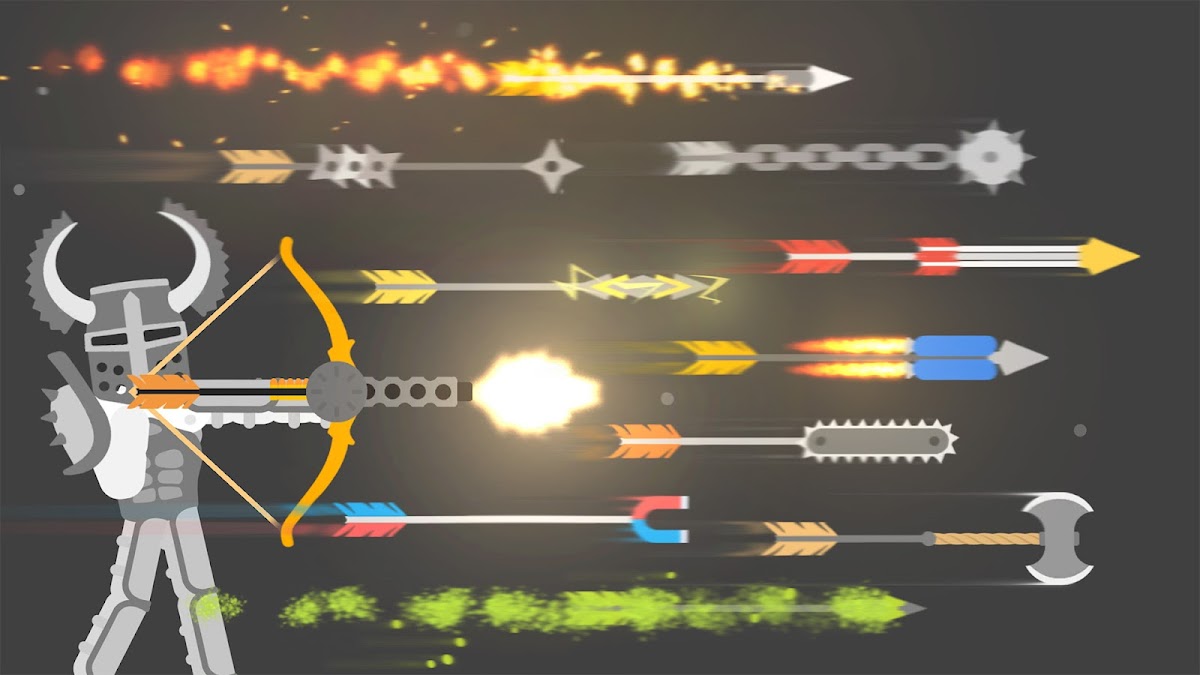 🔥 Уникальные стрелы: существуют различные типы стрел, многие из которых уникальны для мобильного рынка, например, стрела-бензопила, магнитная стрела, гарпунная стрела, пулеметная стрела и другие. Освойте их все, чтобы доминировать на игровой площадке.