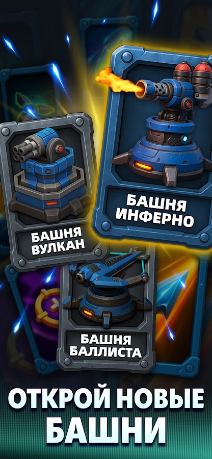 • Откройте мегабашню и соберите боевую колоду с учетом своей стратегии обороны. Какие карты башен выпадут — решит фортуна.