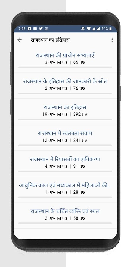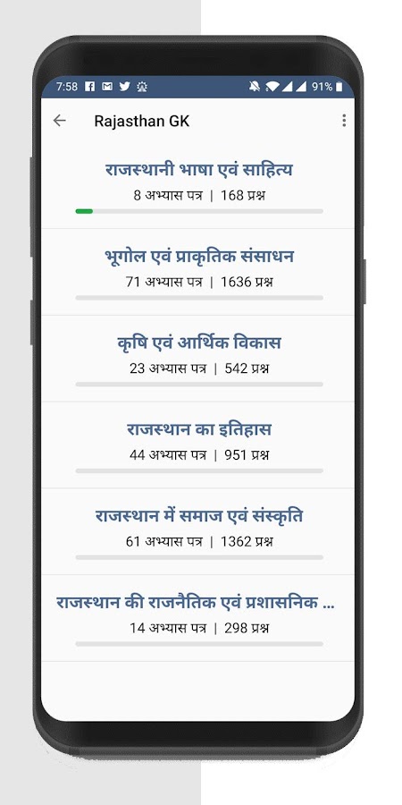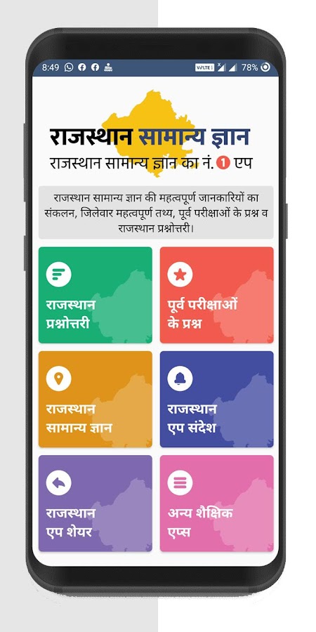 В этом приложении на хинди даны 5000 вопросов объективного типа, 1500 вопросов предыдущего экзамена и примечания ГК Раджастхана.
