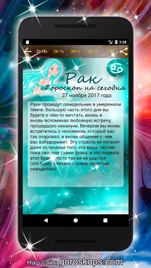 Раки, живущие под опекой Луны, удивительным образом сочетают в себе рационализм и эмоциональность. Каждое из этих качеств актуально в определённое время. Вы без труда определите эти моменты, если всегда под рукой будет гороскоп на каждый день. Его вы найдёте в приложении, перейдя в раздел «Гороскоп на сегодня». Лёгким движением пальца, перелистнув страницу, вы перейдёте в гороскоп на завтра, где находится информация характеризующая день грядущий.