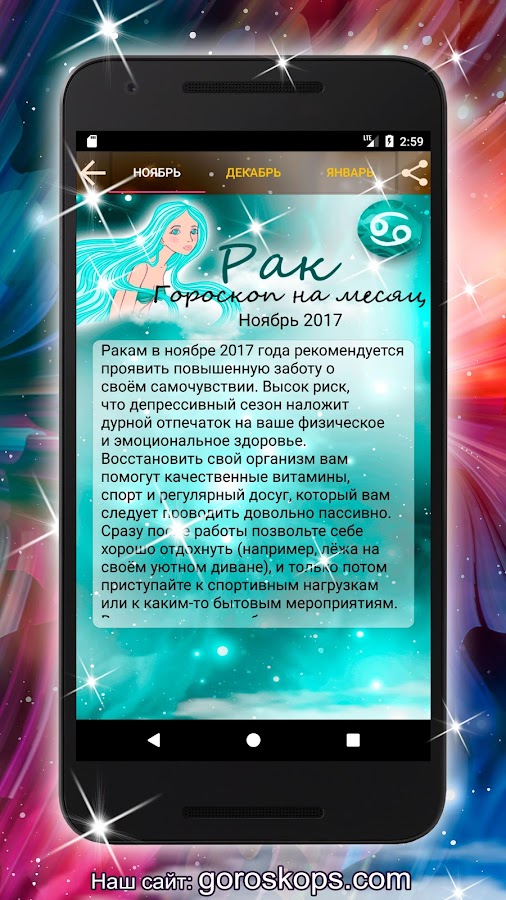 В приложении все представители вашего обаятельного и бесконечно харизматичного знака найдут долгосрочный прогноз о том, что ждёт Раков в текущем году. В разделе Гороскоп писано всё, что с высокой долей вероятности произойдёт в жизни Раков в этом году. Уже сейчас вы можете приступить к изучению этих астропрогнозов. Всё, что нужно — скачать гороскоп Рака и установить приложение.