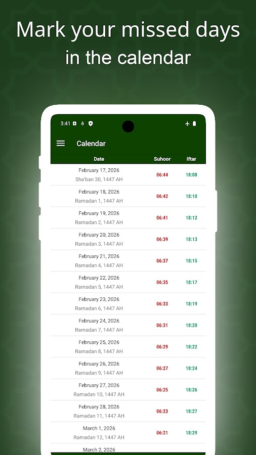 Этот календарь Рамадана для Android предоставляет время намаза, сухурa и ифтарa, а также другую полезную информацию в течение этого священного месяца.