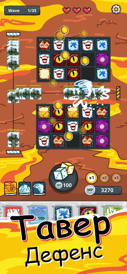 Ты получаешь MP за убийство врагов. MP можно тратить на улучшение уровня дайсов внутри игровой сессии. Кубики одного типа можно объединять друг с другом, чтобы прокачивать их до более сильных. При этом их скорость атаки будет существенно увеличена, и они будут наносить больше урона.