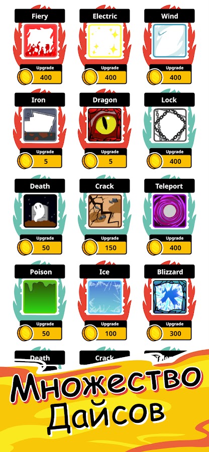 После прохождения уровня вы получите монетки за количество убитых врагов. За эти монеты можно будет улучшить ваши дайсы, делая их более могущественными и сильными. С каждой прокачкой ты делаешь свои кубики сильнее и усиливаешь их особые свойства.