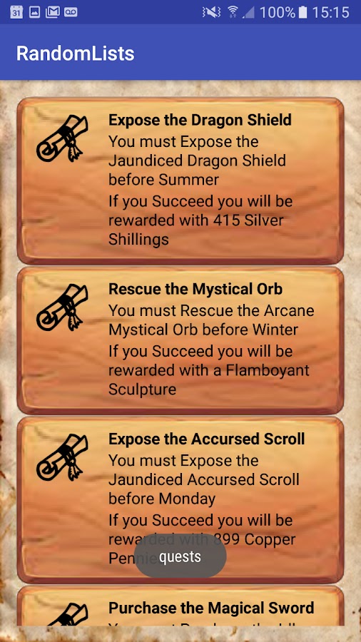 Выберите тип списка (имена, места, квесты, сокровища, даже черты характера), и вам будет представлен случайный список!
