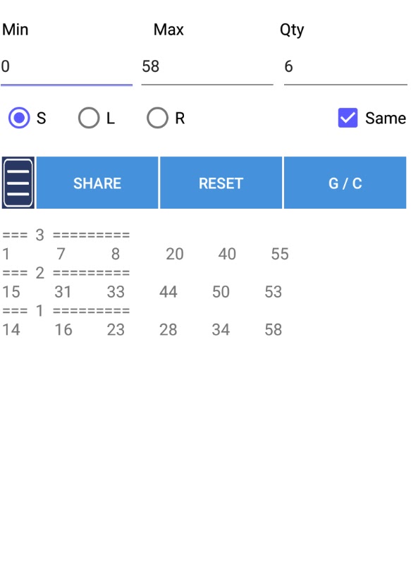 2. Выберите тип сортировки, S (от небольшого числа до большого числа) или L (от большого до малого) или R (случайный).
